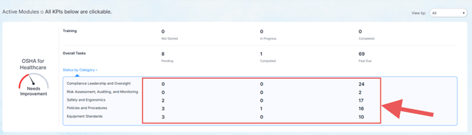 Each compliance module (OSHA, HIPAA Security, HIPAA Privacy, ACA/OIG) now includes a “Status by Category” row that expands when you click the ▼ button.